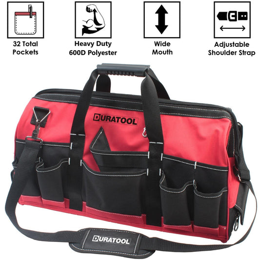 DURATOOL 22-inch Heavy Duty Large Tool Bag with 27 Pockets, Adjustable Strap, Wide Mouth Tools Bag Organizer for Construction